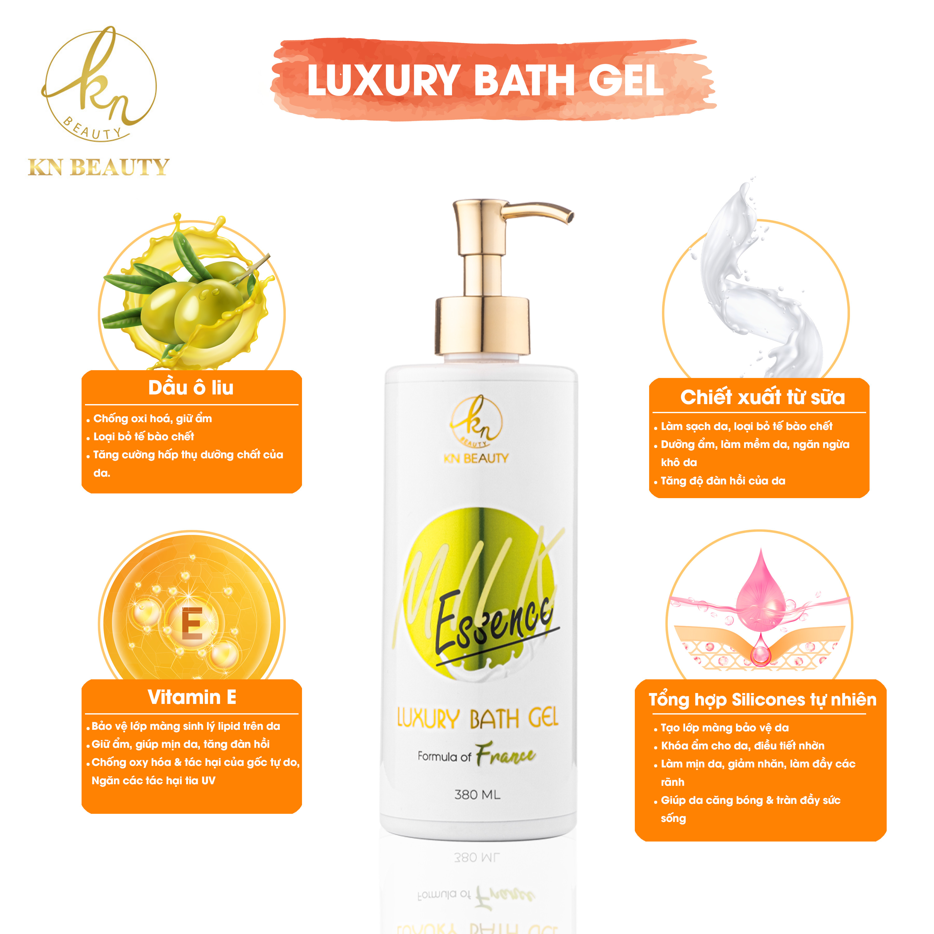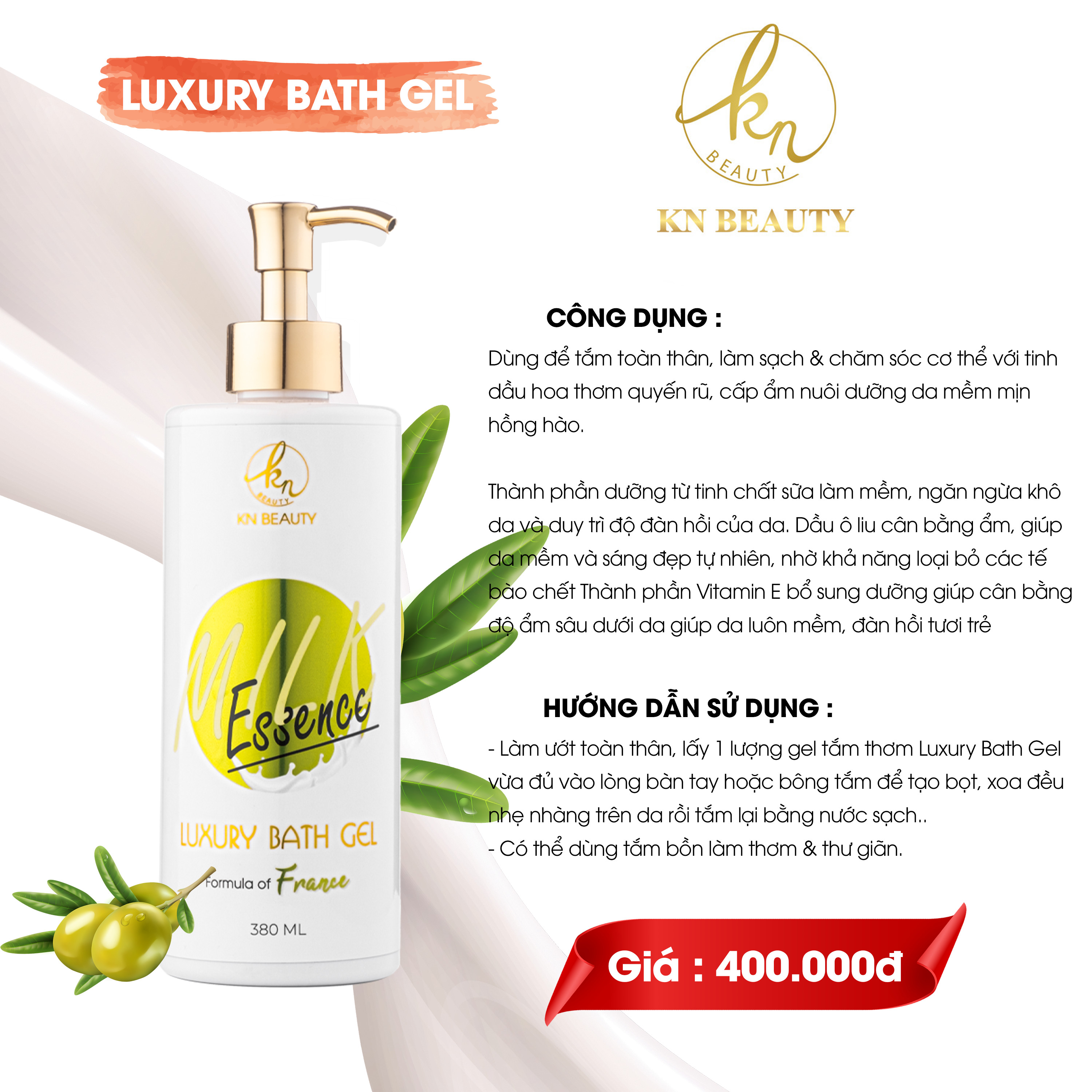 Sữa tắm tinh chất Sữa & Dầu Ô liu KN Beauty – Luxury Bath Gel MILK essence được bào chế từ hương liệu độc quyền của PHÁP, dùng để tắm toàn thân, nhẹ nhàng chăm sóc làm sạch cơ thể cùng với hương thơm ngọt ngào, dịu nhẹ, dưỡng ẩm sâu cho da, nuôi dưỡng làn da mềm mịn và tăng độ đàn hồi cho da.