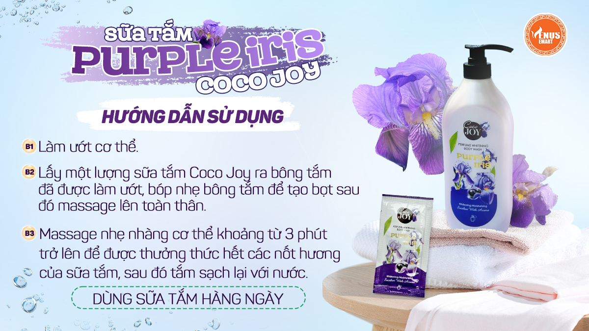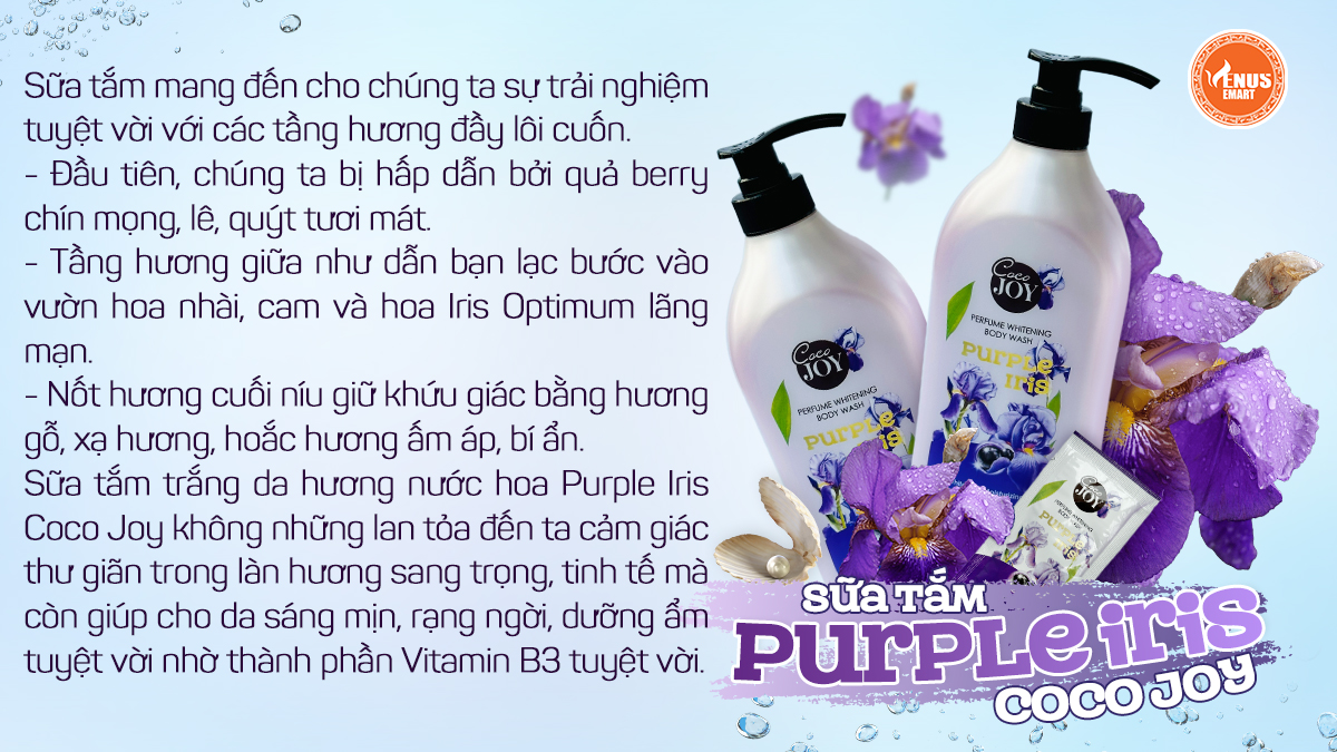Sữa tắm trắng da hương nước hoa Purple Iris được Coco Joy lấy cảm hứng từ nhà điều chế nước hoa. Iris gắng liền với người Hy Lạp tượng trưng cho quyền lực và sức mạnh của Hoàng gia.