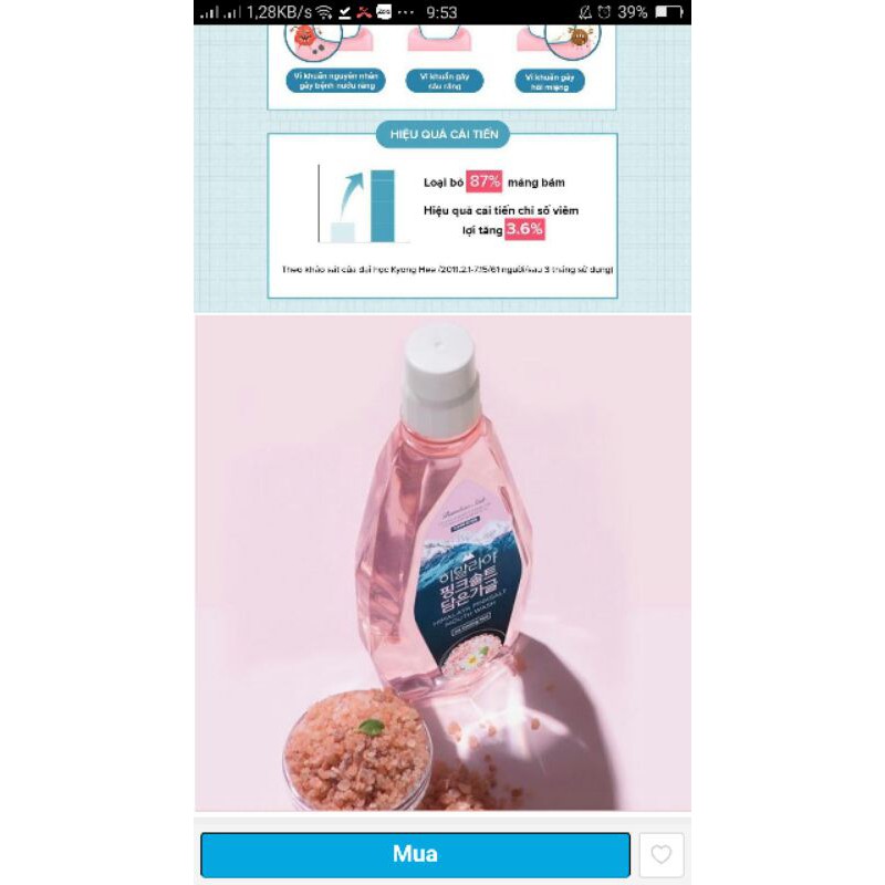 Dãy núi Himalaya hùng vĩ trải qua hàng chục triệu năm, ánh sáng mặt trời thiêu đốt khiến nước biển bay hơi, các tinh thể muối kết hợp với các khoáng chất tự nhiên trong lòng đất dần kết tinh và hoá thạch. Từ đó hình thành nên những mỏ đá muối Himalaya ngày nay. Để khai thác được loại đá muối quý giá như vậy, quy trình khai thác cũng vô cùng khó khăn. Với sự kiên trì và bằng sức lao động bền bỉ của người thợ mỏ trong điều kiện khắc nghiệt, di chuyển khó khăn để tiếp cận các mỏ muối, để có được sản phẩm muối hồng vô cùng tinh khiết, không bị pha bất kỳ tạp chất nào. Muối hồng Himalaya là loại muối tinh khiết trên thế giới mà không thể tìm thấy ở bất cứ nơi nào khác. Muối hồng tinh thể chứa đến 84 trong tổng số 92 loại khoáng chất có lợi cho sức khoẻ mà không có bất kỳ một loại muối tự nhiên hay nhân tạo nào có thể sánh bằng. Thành phần: Muối hồng Himalaya quý hiếm, muối tre và rau má. Hướng dẫn sử dụng: Sử dụng hàng ngày, sau khi đánh răng, súc miệng với 10 - 15ml nước súc miệng trong vòng 30 giây rồi nhổ đi. Không dùng cho trẻ em dưới 6 tuổi, không được nuốt. Tránh tiếp xúc trực tiếp với mắt hay da. Nếu vô tình để nước súc miệng dính vào mắt phải rửa ngay lại bằng nước sạch. Bảo quản nơi khô ráo, thoáng mát, tránh nhiệt độ cao. Hạn sử dụng: 3 năm kể từ ngày sản xuất. Xuất xứ: Hàn Quốc.