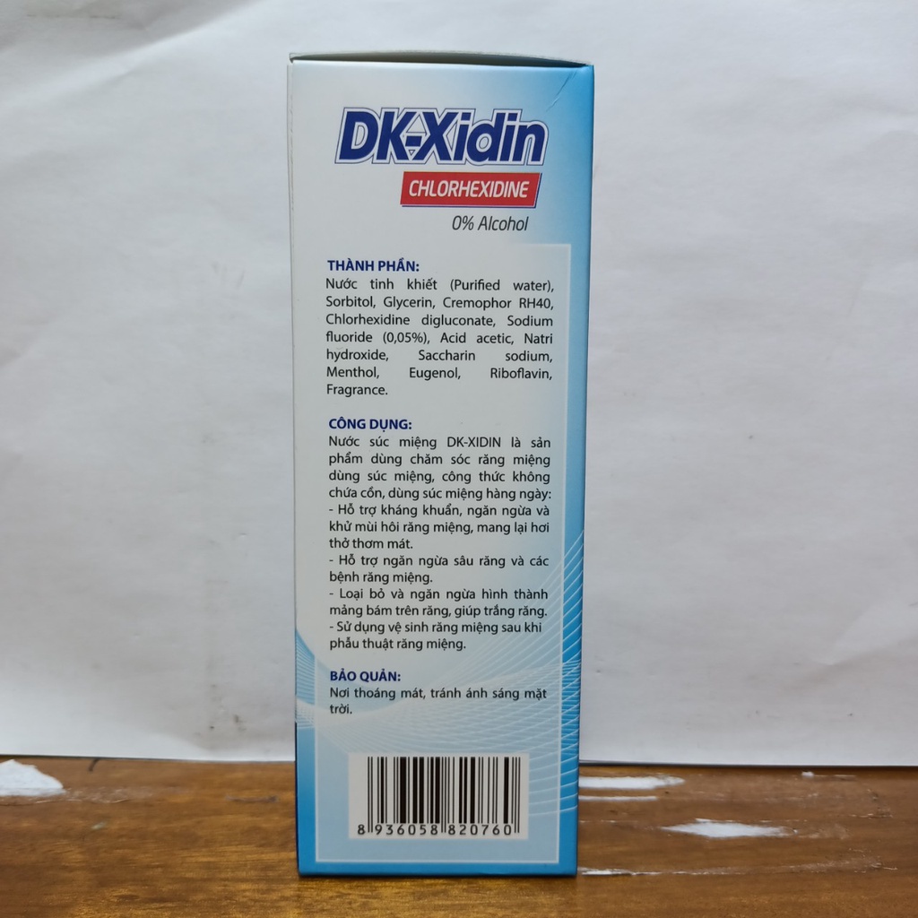 Thành phần Nước tinh khiết, Sorbitol, Glycerin, Cremo-phor Rh40, Chlorhexidine digluconate, sodium Fluoride ( 0.05%), acid acetic, natri hydroxyde, Saccherin, Menthol, Riboflavin, Fragrance. Công dụng Hỗ trợ kháng khuẩn, ngăn ngừa và khử mùi hôi khoang miệng, mang lại hơi thở thơm mát. Hỗ trợ ngăn ngừa sâu răng và các bệnh răng miệng. Loại bỏ và ngăn ngừa hình thành mảng bám trên răng giúp trắng răng. Sử dụng vệ sinh răng miệng sau khi phẫu thuật răng miệng. Liều dùng Dùng nước súc miệng hàng ngày, 2-3 lần vào buổi sáng tối trước khi đi ngủ, sau khi đánh răng hoặc sau khi ăn các thức ăn có mùi tanh, hôi, hút thuốc lá. Mỗi lần 10-15ml với người lơn và 5-10ml đối với trẻ em, súc miệng ít nhất trong thời gian 30 giây để loại bỏ mảng bám và diệt khuẩn rồi bỏ đi. Có thể pha loãng gấp đôi với nươc sạch để dùng cho trẻ em. Sử dụng sản phẩm thường xuyên kết hợp với đánh răng để bảo vệ sức khỏe răng miệng tốt nhất.