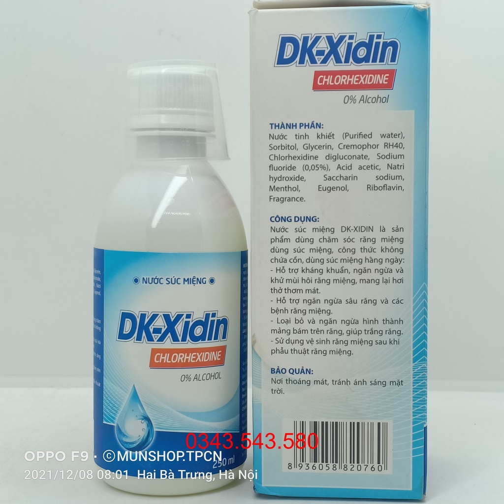Hướng dẫn sử dụng DK-Xidin: Dùng súc miệng hằng ngày, ngày 2 – 3 lần vào buổi sáng, tối trước khi đi ngủ, sau khi đánh răng hoặc sau khi ăn uống các thức ăn có mùi ta.nh, hôi, hút thu.ốc lá… Mỗi lần 10 – 15ml với người lớn và 2 – 10ml với trẻ em, súc miệng trong ít nhất 30 giây rồi nhổ đi. Có thể pha loãng gấp đôi với nước sạch khi dùng cho trẻ con Sử dụng sản phẩm thường xuyên, kết hợp với đánh răng hàng ngày để bảo vệ răng miệng tốt nhất Lưu ý: Sử dụng cho trẻ em từ 3 tuổi trở lên Không nên đánh răng hoặc ăn sau khi súc miệng 30 phút, không được nuốt Sản phẩm có chứa Natri florua Quy cách: Hộp 1 chai 250ml