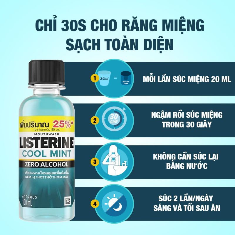 HDSD: Sau khi đánh răng, súc miệng với 20ml Listerine trong 30 giây rồi nhổ đi. Không được nuốt. Được khuyên sử dụng hàng ngày. Không dùng cho trẻ em dưới 12 tuổi
