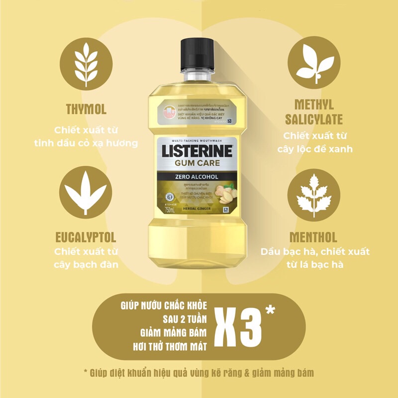 THÀNH PHẦN: Công thức 4 tinh dầu tự nhiên giúp diệt khuẩn nhanh gấp 2 lần so với các loại nước súc miệng khác: - Eucalyptol: Có tính sát khuẩn - Thymol: Có tính kháng khuẩn cao - Menthol: Hiệu quả trong việc diệt khuẩn - Methyl Salicylate: Đem lại vị the mát Ngoài ra, Listerine Gum Care còn chứa tinh chất gừng thảo mộc tự nhiên giúp nướu chắc khỏe hơn sau 2 tuần.