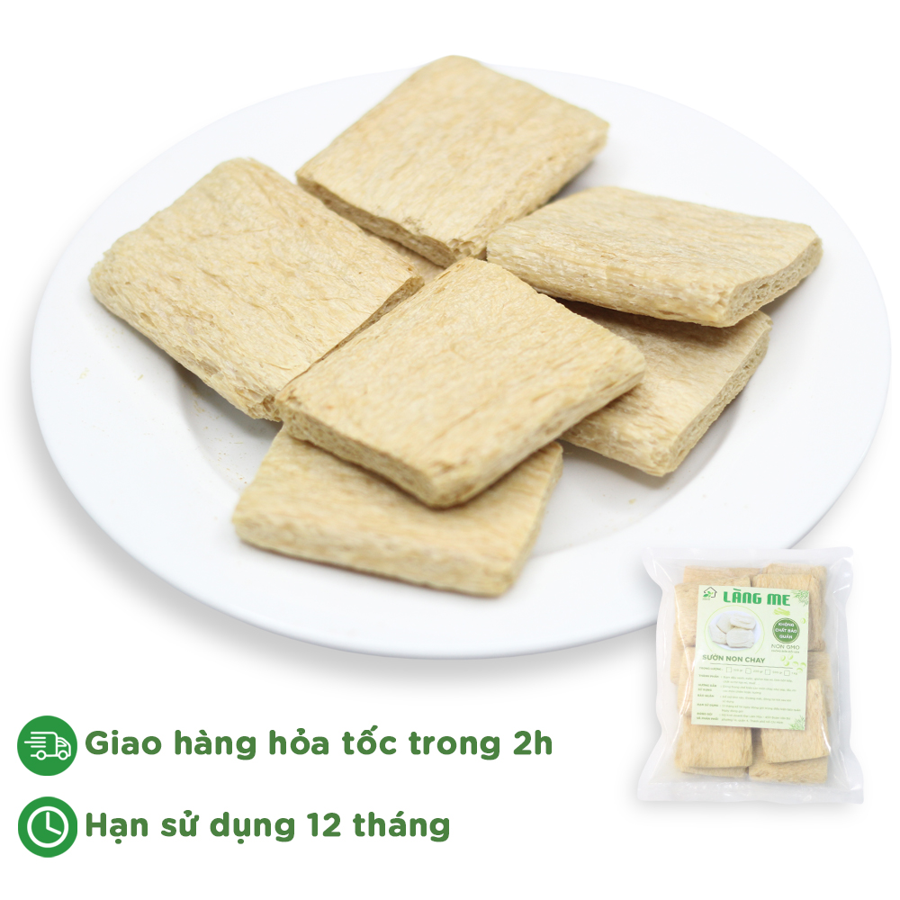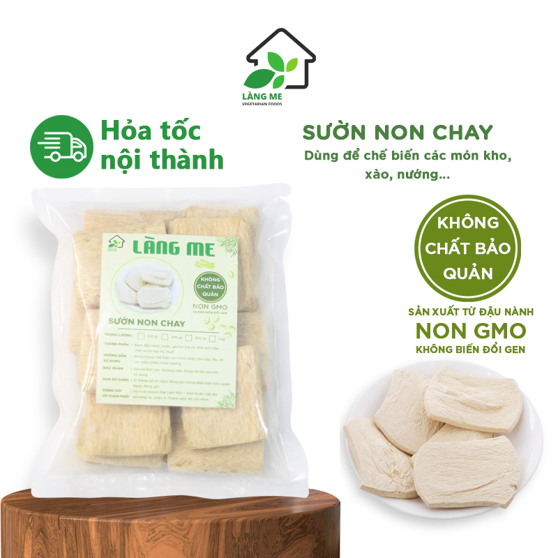 + Thực phẩm chay Làng Me làm từ 100% đậu nành, nước, lúa mì, tinh bột bắp,..