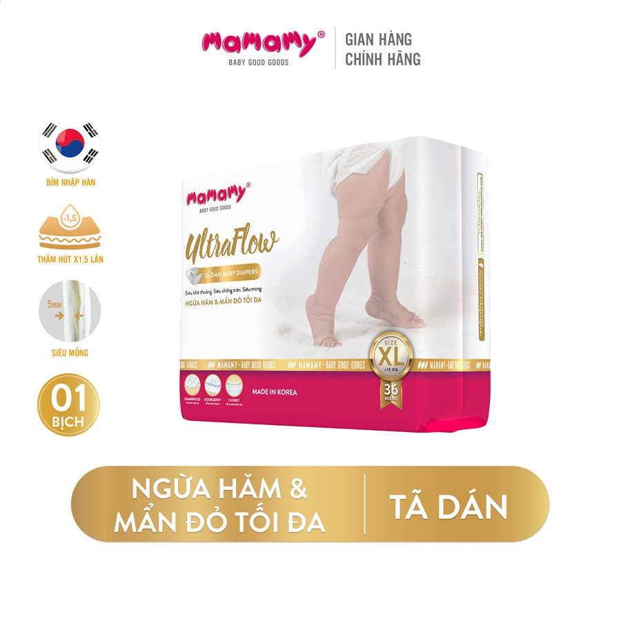 1. ĐẶC ĐIỂM NỔI BẬT Tã bỉm Mamamy Ultraflow ngừa hăm & mẩn đỏ tối đa - vấn đề bố mẹ lo lắng nhất khi sử dụng tã cho con. Bỉm thêm hạt SAP siêu thấm hút giúp thấm hút gấp 1.5 lần và chống tràn ngược. Bỉm sử dụng bông tự nhiên nhập khẩu Canada tránh vón cục. Tã bỉm siêu mỏng chỉ 0.5 cm. Bề mặt của bỉm Diamond 3D với hàng nghìn lỗ thấm hút, giữ mặt tã luôn khô thoáng, hạn chế da bé tiếp xúc với môi trường ẩm ướt chứa vi khuẩn. Lớp đáy Air Through tỏa nhiệt 360 độ ngăn hấp hơi, để bé không bí bách kể cả trong những ngày thời tiết gay gắt nhất. Đường cắt võng quanh đùi chống tràn đùi và hạn chế xô lệch bỉm khi bé vận động mạnh. Chun eo bỉm dài chống tràn lưng khi bé ngủ. Tã bỉm nhập khẩu trực tiếp từ Hàn Quốc & Đạt chứng nhận KOTITI Hàn Quốc.