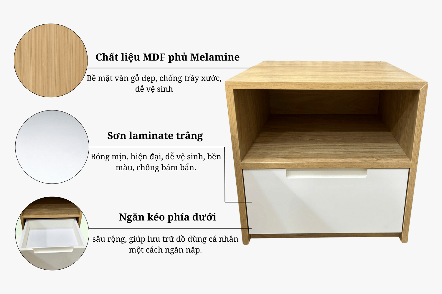 | Hướng dẫn sử dụng | Công Năng & Tiện ÍchHộc tủ tiện íchcho sách, đèn ngủ, đồ dùng thường xuyên.Ngăn kéo rộng rãigiúp lưu trữ gọn gàng, kín đáo.Bàn đa năng: Mặt tủ có thể dùng như bàn học hoặc làm việc.Ray trượt giảm chấnmang lại trải nghiệm sử dụng êm ái.Thiết kế đa năng, phù hợp nhiều phong cách nội thất.Tiết kiệm diện tích, lý tưởng cho không gian sống nhỏ gọn. |