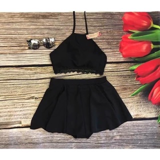 Bikini yếm ren đen mix cùng váy xòe lưng cao kín đáo