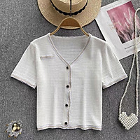 Áo croptop dệt kim sơ mi nữ tay ngắn cổ V cúc ngọc viền thời trang thiết kế Quảng Châu cao cấp