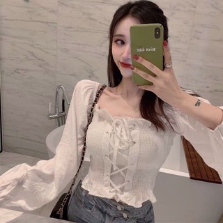 Áo thổ cẩm viền ren croptop đan dây corset phong cách pháp