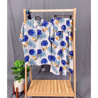 Đồ đôi nam nữ đi biển đẹp, set váy + áo nam sơ mi hoạ tiết phong cách Hàn Quốc