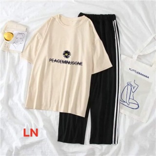 Áo hoa cúc peace chữ nhỏ giữa ngực+ quần ba sọc LN11