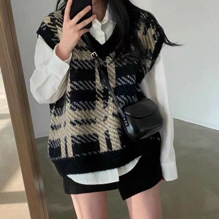 Áo gile len hàn quốc nữ kiểu dáng ulzzang họa tiết kẻ viền cổ v - 039