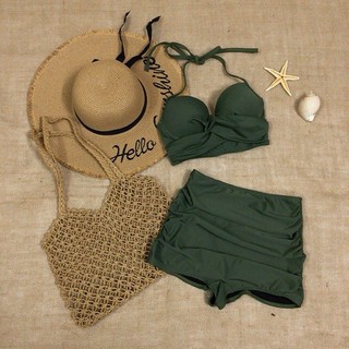[ĐỒ BƠI HAI MẢNH] Bikini lưng cao 2 mảnh áo crop xoắn nâng ngực mix quần short nhún kín đáo (HÌNH THẬT)