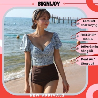 [ĐỒ BƠI] Bikini lưng cao 2 mảnh áo crop xoắn nâng ngực mix quần short nhún kín đáo