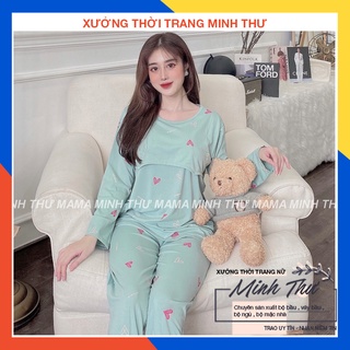 Bộ Bầu Pyjamas Mặc Nhà, Đồ Bầu Sau Sinh Mở Cúc Cho Con Bú và Quần Chun Chỉnh Bụng, Dài Tay