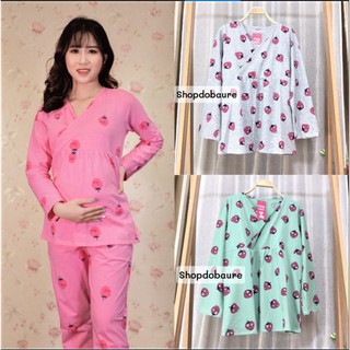 Bộ bầu và sau sinh DÀI TAY hình quả dâu, chất thun cotton co giãn, vén chéo cho con bú - 𝐁𝐃𝟏𝟐