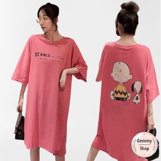 Đầm thun bầu dáng suông bigsize nữ tay lỡ cổ tròn xẻ tà form từ 50-75kg in walk vàng YoYo