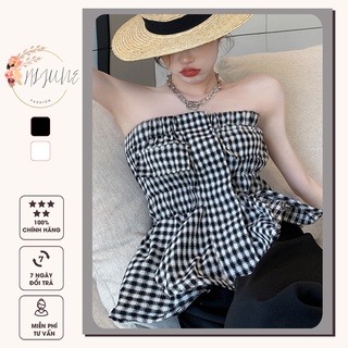 Áo trễ vai lửng họa tiết sọc caro phối giả túi thời trang gợi cảm cho nữ HIJUNE AK06