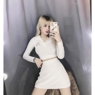 set bộ xinh áo croptop cổ bẻ tay dài mix chân váy xinh