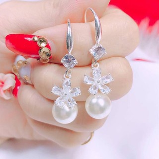 Bông tai nữ bạc ta dạng móc dài hình hoa gắn đá sáng lấp lánh - Bông tai bạc Bibi
