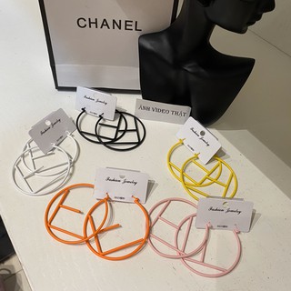 BD93 Bông tai tròn chữ F màu sắc đen trắng cam hồng vàng đường kính 6cm