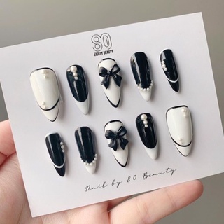 [MỚI] SET 10MÓNG UP MỸ ĐEN TRẮNG GẮN NƠ +KẺ ĐẦU MÓNG