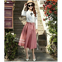 Chân Váy Midi Nữ Kaki Nơ Eo Hàng Cúc Giữa dưới 60kg - Eo Viền Bèo Dáng Dài Nhiều Màu
