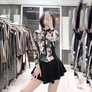 Bikini đi biển 2 mảnh kín đáo - Đồ bơi nữ tay dài váy xòe - Áo bơi croptop họa tiết hoa xinh freesize (45-58kg)