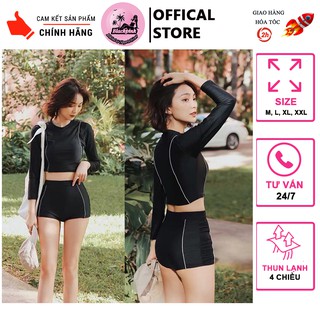 Bikini đi biển 2 mảnh kín đáo - Đồ bơi nữ tay dài váy xòe - Áo bơi croptop đen trơn mẫu mới 2022 (45-60kg)
