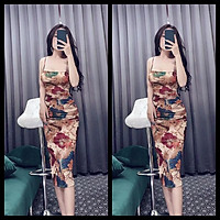 Đầm body sườn xám cổ tàu xẻ tà hoạ tiết xịn xò