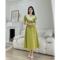Đầm xoè midi đính nút phối cổ bèo to kèm dây buộc eo