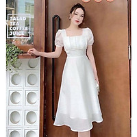 Đầm trắng cổ vuông tay phồng xếp li ngực Kenny Dress