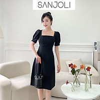 Váy Công Sở Nữ SANJOLI Đầm Dự Tiệc Thiết Kế Cổ Vuông Tay Phồng Họa Tiết Xếp Ly Phong Cách Hàn Quốc Sang Trọng VD017