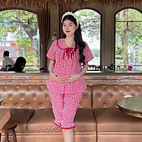 Bộ Đồ Bầu Lửng Karo Mẫu Mới Mùa Hè 2025 Mặc Nhà Chất Cotton Hàn Nhẹ Mát Có Chun Điều Chỉnh - Đỏ