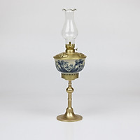 01 Đèn dầu thờ chân đồng gốm Bát Tràng men lam vẽ phong cảnh