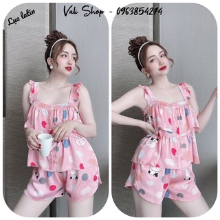 Đồ ngủ lụa latin 2 dây áo bèo tầng quần đùi hoạ tiết freesize từ 40-57kg mặc đẹp