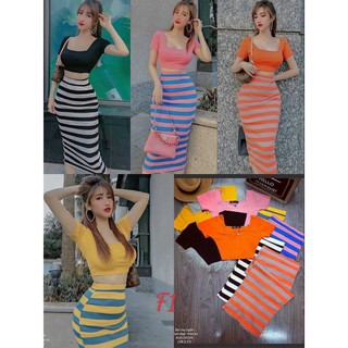 sét bộ nữ chân váy ôm bút chì kiểu sọc ngang tôn dáng kèm áo cổ vuông