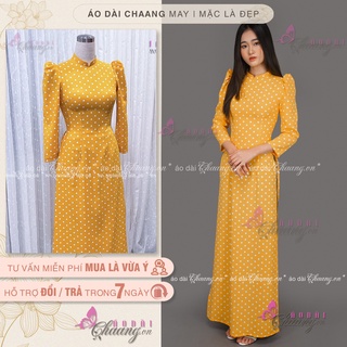 Áo Dài Truyền Thống Chấm Bi Vàng Vai Bồng May Sẵn Lụa Thái Cổ Vuông Đẹp ChaangBi08