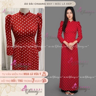 Áo Dài Đỏ Đô Chấm Bi Trắng Tay Vai Bồng May Sẵn Cổ Vuông Truyền Thống Dự Tiệc Lễ Tết Đẹp
