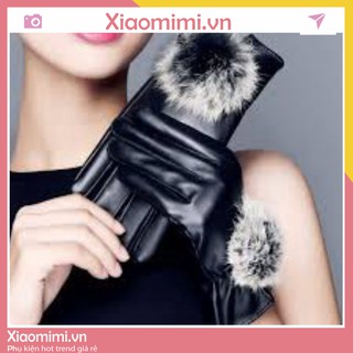 Găng tay da cảm ứng đính quả bông thời trang nữ, Găng Tay Da Nữ Lót Lông Quả Bông có cảm ứng