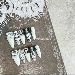 Móng úp thiết kế giá rẻ màu đen kẻ dạ tweet đính nơ Cebi.nailbox c004