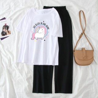 Sét Bộ Đồ Nữ Mặc Đi Chơi, Mặc Ở Nhà Mùa Hè, Áo Phông Cotton Mát Mịn In Ngựa 1 Sừng Kèm Quần Thun Cát Phong Cách Hàn Quốc