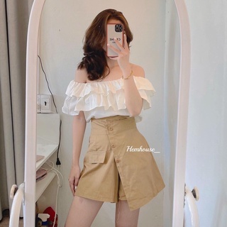 Sét áo trễ vai bèo + quần đùi giả váy kaki