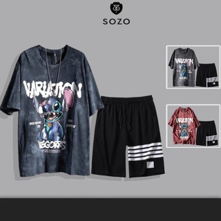 Set Bộ 2 Món Quần Shorts + Áo Thun Nam Chất Vải Thun CB2_MSH001THDEF6_WAT462CT (3 Kẻ Ngang + Loang Khủng Long Stitch)