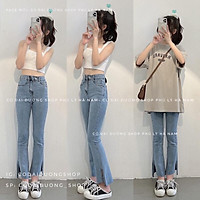 [RÁCH STORE] Áo gân cổ tròn 4 nút kẻ tay ngắn (7923)- Quần jean loe trơn xẻ lai (8499)