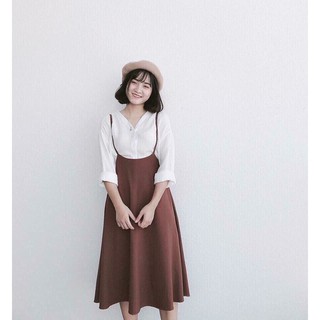 Sét Váy Yếm Xòe + Áo Sơ Mi Cổ Sen Ulzzang Phong Cách Hàn Quốc