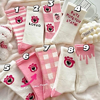 Vớ cotton cổ cao hình gấu dâu LOSTO dễ thương Hàn Quốc - Tất cao cổ hoạ tiết gấu hồng co giãn