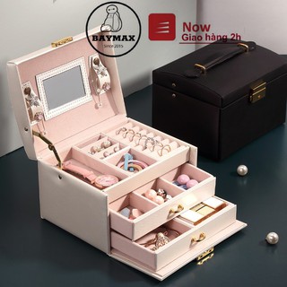 [Mã FAMARAL2 giảm 10K đơn 50K]Hộp Đựng Trang Sức Cao Cấp Bọc Da PU 3 tầng Có Khóa chống trộm (size 18x14x13 )