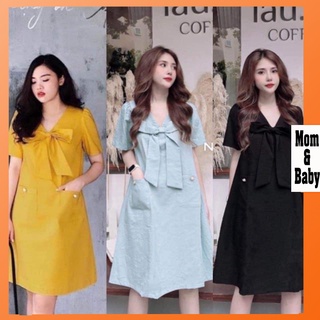 váy suông cổ hoa bèo đính nơ chất đũi bầu bí bon chen thoải mái