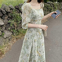 VÁY HOA XANH CỔ VUÔNG TAY LỠ
